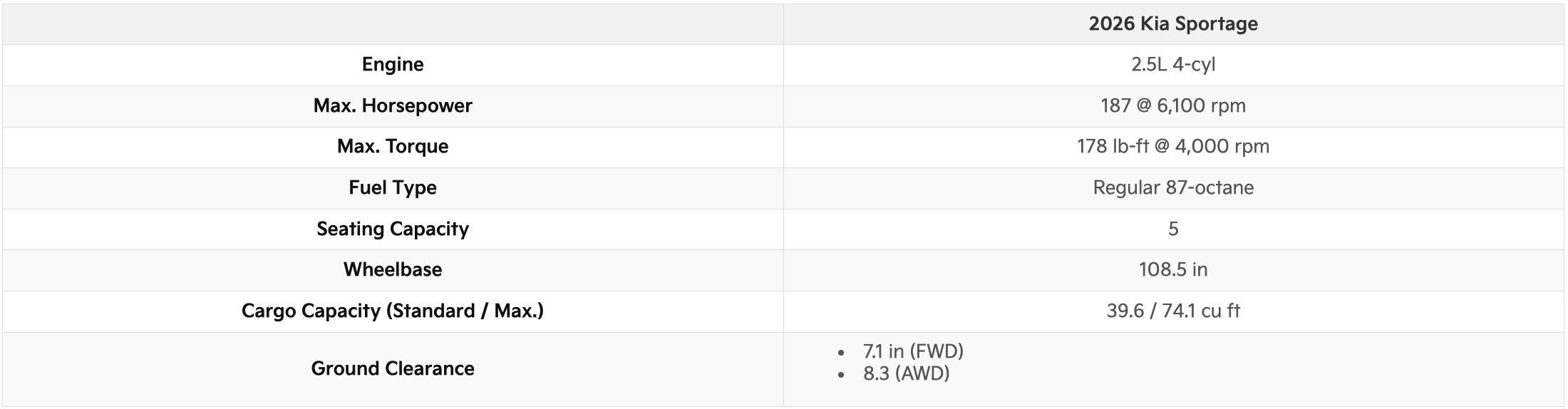 The new 2026 Kia Sportage is powered by a 2.5-liter four-cylinder engine that makes 187 horsepower and is mated with an eight-speed automatic transmission. This SUV earns a manufacturer-estimated 25/33/28 MPG (City/Highway/Combined)1 with front-wheel drive or up to 24/30/26 MPG (City/Highway/Combined)1 with all-wheel drive.