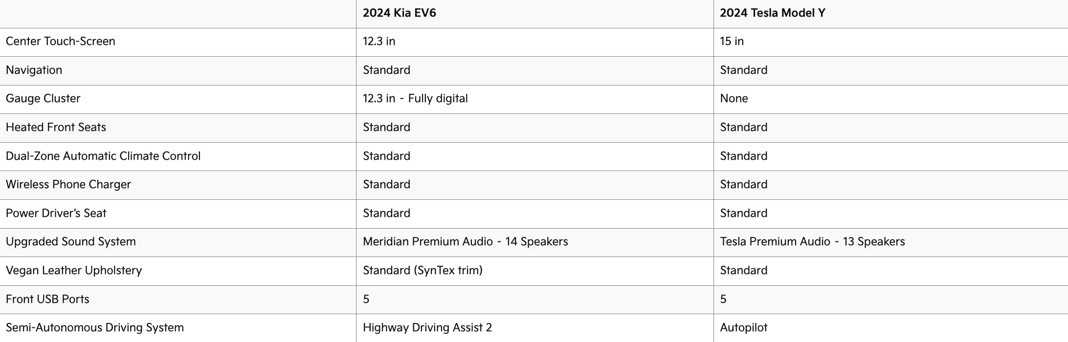But most drivers will be looking for a trim in between the base and top models. In this area, the 2024 Kia EV6 vs. Tesla Model Y comparison is also won by the EV6.