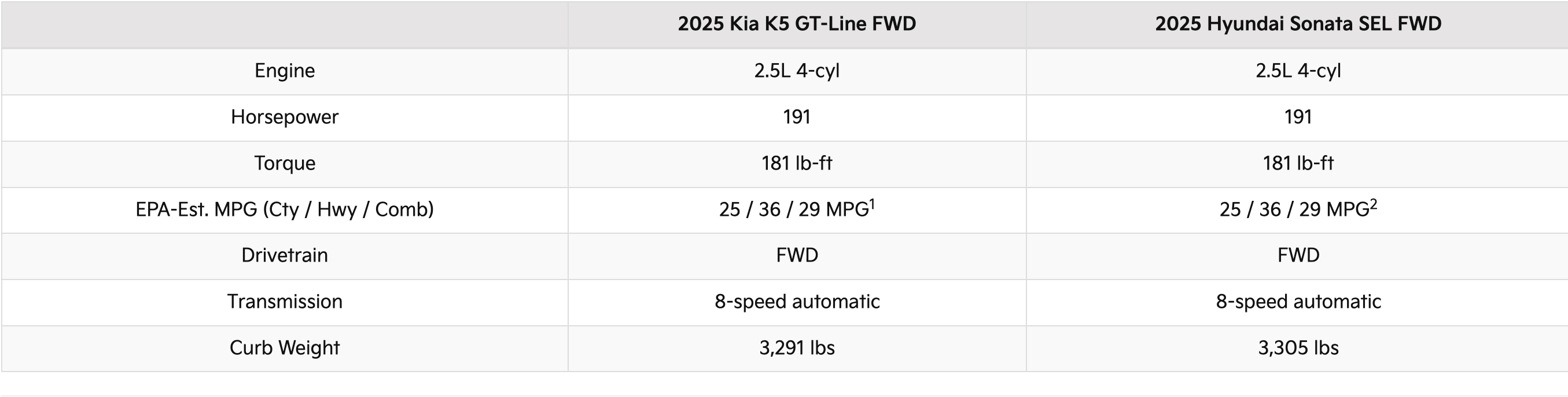 See more details below with our 2025 Kia K5 vs. 2025 Hyundai Sonata chart.