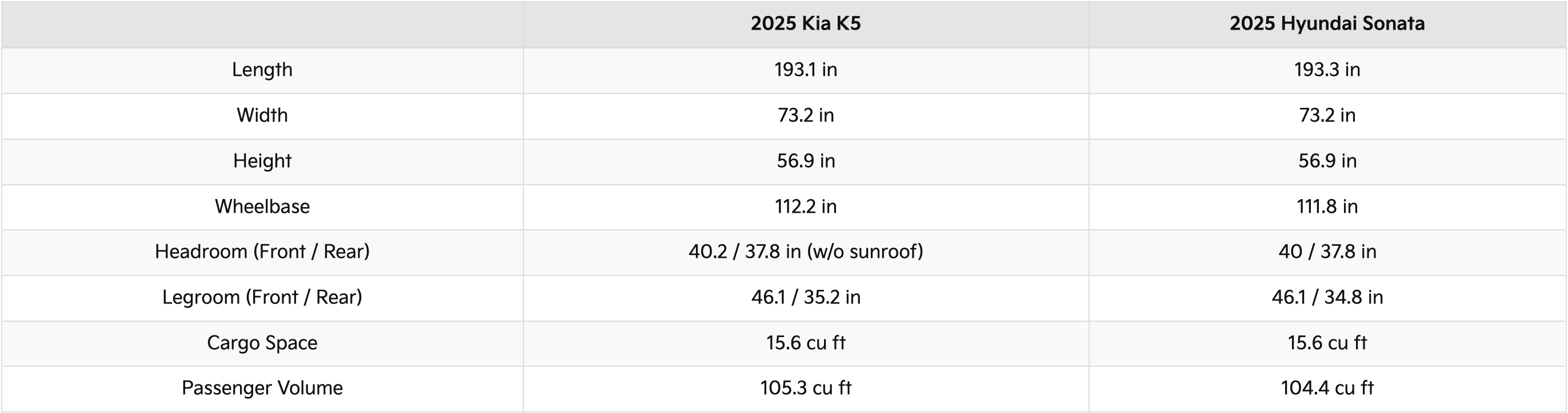 2025 Kia K5 vs. Hyundai Sonata Cargo Space & Dimensions