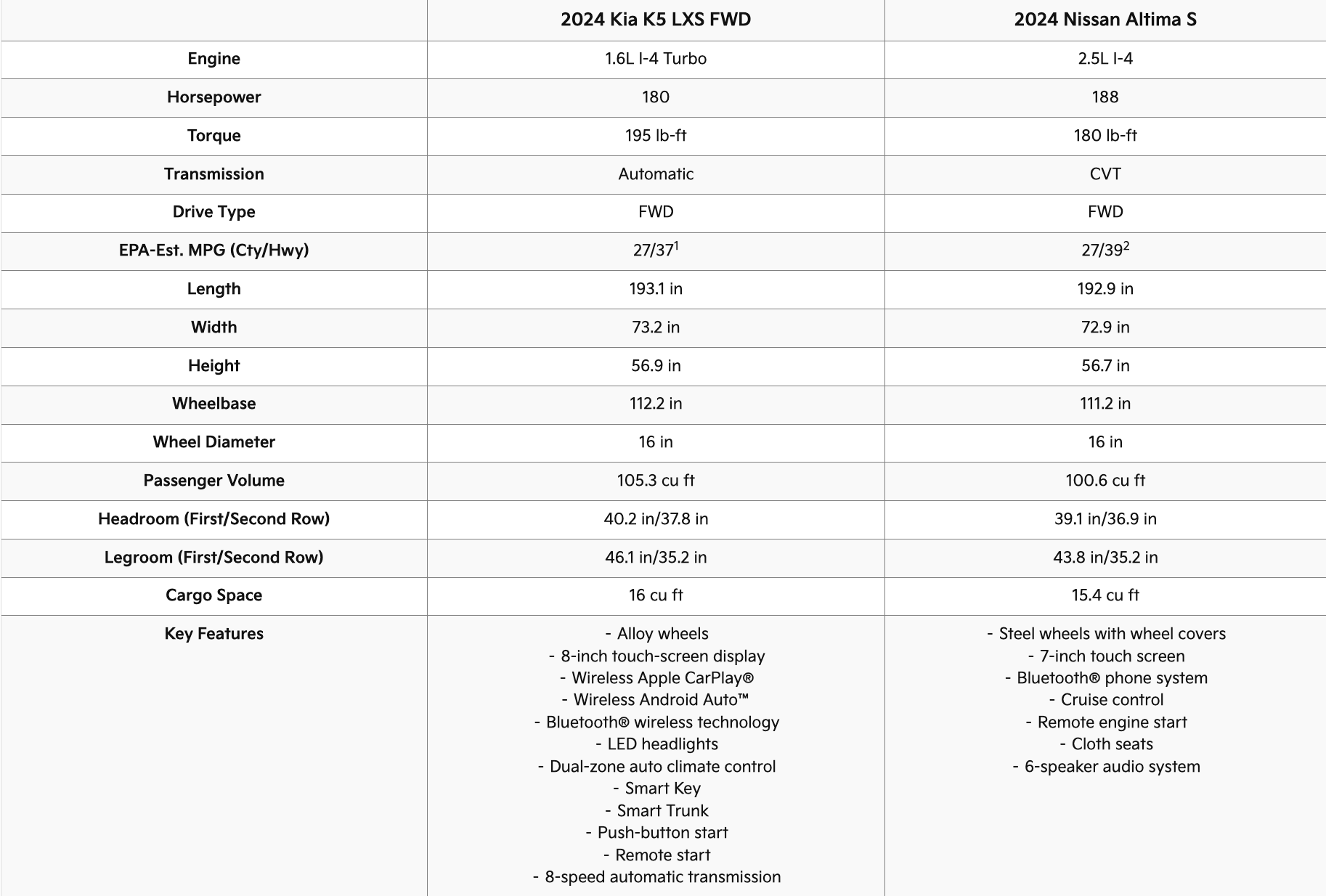 2024 Nissan Altima vs. 2024 Kia K5 Specs