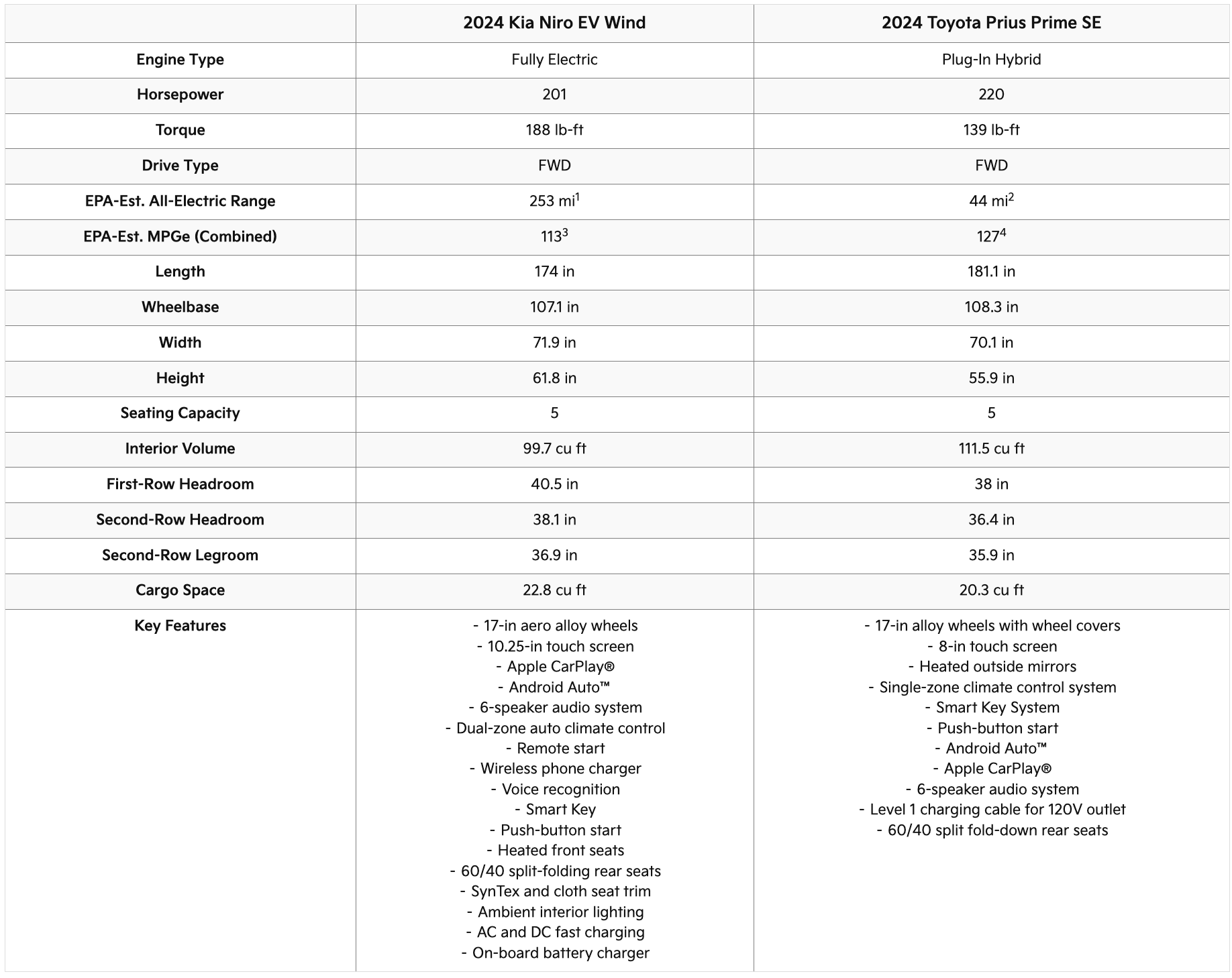2024 Toyota Prius Prime vs. 2024 Kia Niro EV Specs & Size